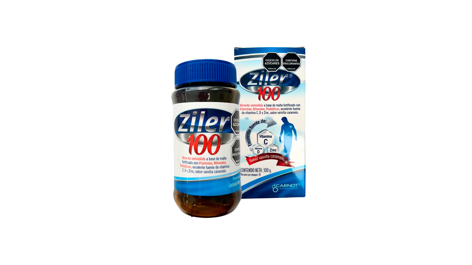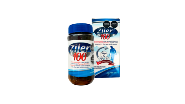 Ziler® 100 es un alimento semisólido a base de malta, fortificado con 11 vitaminas, 6 minerales y probióticos (Bacillus coagulans), sabor vainilla caramelo .